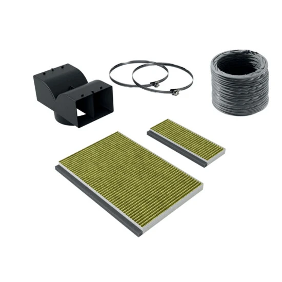 Bestehend aus 2 Clean Air Plus Aktivkohlefiltern, Umluftweiche, flexiblem Schlauch, 2 Schlauchschellen und Montagematerial