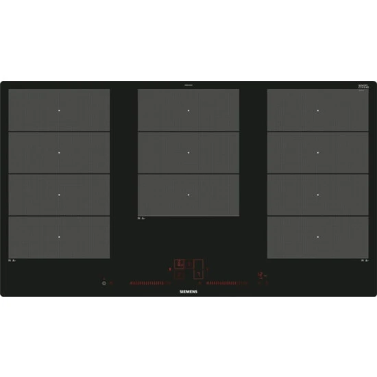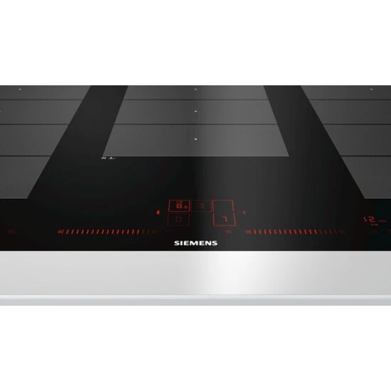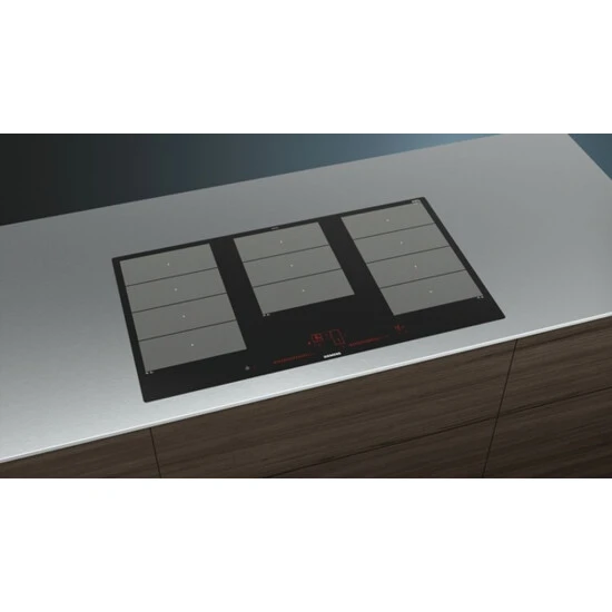 Siemens EX901LXC1E. Produktfarbe: Schwarz, Geräteplatzierung: Integriert, Kochfeldtyp: Zonen-Induktionskochfeld. Steuerung: Berührung, Steuerungsposition: Vorne oben. Anschlusswert (elektrisch): 11100 W, AC Eingangsspannung: 220-240 V, AC Eingangsfrequenz: 50 – 60 Hz. Breite: 892 mm, Tiefe: 512 mm, Höhe: 56 mm