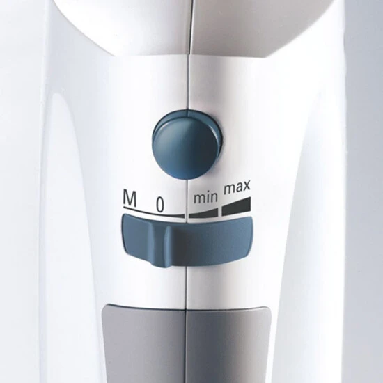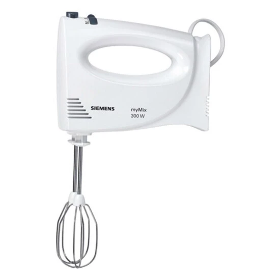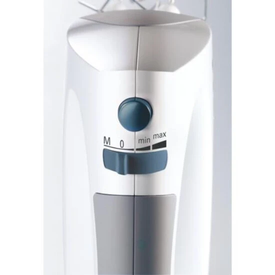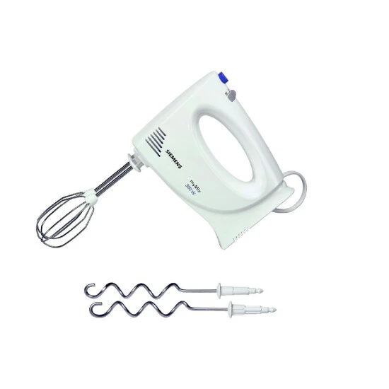 Das Handrührgerät aus dem Hause Siemens arbeitet mit einem 300 Watt starken Motor. Mit den vier Geschwindigkeitsstufen und der Momentstufe kann die Drehzahl individuell eingestellt werden. Das ergonomisch geformte Gehäuse besteht aus schlagfestem Kunststoff und ist sowohl für Links- als auch für Rechtshänder geeignet. Eine separate Auswurftaste für Rührbesen und Knethaken ist zudem auch vorhanden.