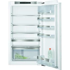 coolEfficiency Einbau-Kühlschrank mit hyperFresh plus Box für bis zu 2 mal längere Frische bei Obst und Gemüse und flexiblem varioShelf. Schnelles Kühlen von Lebensmitteln – superCooling. Mit superCooling können Sie die Temperatur Ihres Kühlschranks für eine eingestellte Zeit senken, um frische Lebensmittel schnell zu kühlen. Damit wird ein unerwünschter Temperaturanstieg der bereits gekühlten Lebensmittel verhindert. Immer die richtige Temperatur – freshSense. Schon geringste Temperaturschwankungen, beispielsweise durch Sonneneinstrahlung auf die Kühl-Gefrier-Kombination, können die Bedingungen im Kühlschrank beeinträchtigen – und damit auch die Frische Ihrer Lebensmittel. Um das zu vermeiden, misst freshSense die Innen- und Außentemperatur des Kühlschranks und erkennt, wenn sich die Umgebungsbedingungen ändern. Sobald eine Änderung erkannt wird, steuert das Kontrollsystem sofort gegen, damit Ihre Lebensmittel möglichst lange frisch bleiben. Eine zweigeteilte Ablage für verschiedene Lageranforderungen – varioShelf. Schaffen Sie vorne im Kühlschrank Platz für besonders große oder hohe Lebensmittel – durch flexible Positionierung der varioShelf-Ablage. Sie besteht aus zwei separaten 14 cm tiefen Glasablagen. Sie können das vordere Element der varioShelf-Ablage unter das hintere Element schieben: für große Schüsseln oder Flaschen, die zusätzliche Lagerhöhe erfordern. Hintereinander platziert bilden die beiden Glaselemente eine komplette Abstellfläche. Mit varioShelf erhalten Sie eine Ablagelösung mit zwei verschiedenen Lageroptionen. Bewegliche Glasablagen erleichtern das Einlagern und Entnehmen von Lebensmitteln – easyAccess Glasablagen. Danke der easyAccess Glasablagen behalten Sie Ihre Lebensmittel bestens im Blick und in Reichweite. Für mehr Komfort beim Einlagern und Entnehmen von Lebensmitteln lassen sich die Glasablagen jetzt auf Profilschienen bequem bis zur Mitte herausziehen. Auch voll beladene Ablagen gleiten leichtgängig und kippsicher. Die rahmenlosen Ablagen bestehen aus hochwertigem robusten Glas. Damit haben Sie die optimale Übersicht, und nichts bleibt verborgen. Bruchsicher und reinigungsfreundlich – die safetyGlas-Ablagen. Alle Glasablagen bestehen aus extrastarkem, reinigungsfreundlichem Sicherheitsglas. Fällt mal etwas um, wird die verschüttete Flüssigkeit eingedämmt und läuft nicht durch den gesamten Kühlraum.