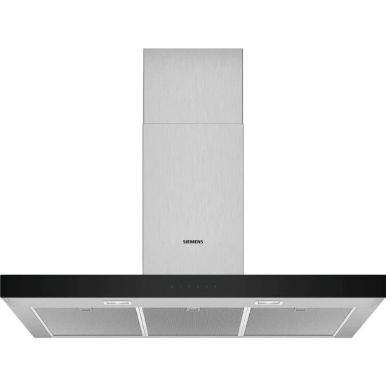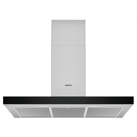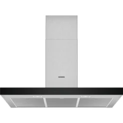 Hotte décorative – Ligne IQ300 – Largeur 90 cm – 4 vitesses dont 1 Intensive temporisée – Commandes TouchControl – Affichage digital – 3 filtres à graisse métalliques lavables au lave-vaisselle – Filtre à charbon en option (référence LZ10DXA00) – En mode recyclage, vous devez impérativement monter le kit de recyclage (référence LZ10DXU00) composé d’un filtre à charbon actif, d’un flexible, de colliers de serrage et d’un conduit d’aération – Eclairage LED – Sortie Ø 120/150 mm – Finition inox et verre noir.