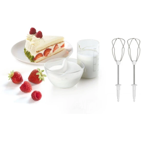 Lieferumfang: Handrührgerät, 2 Rührbesen, 2 Knethaken