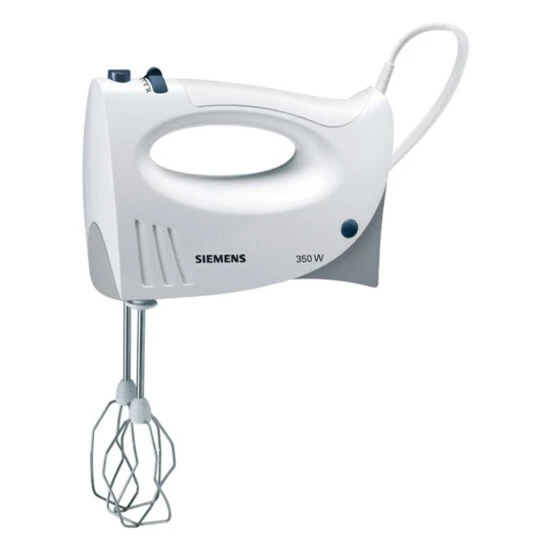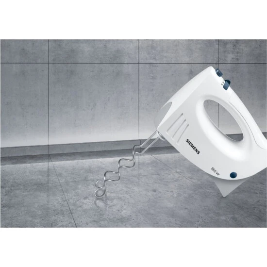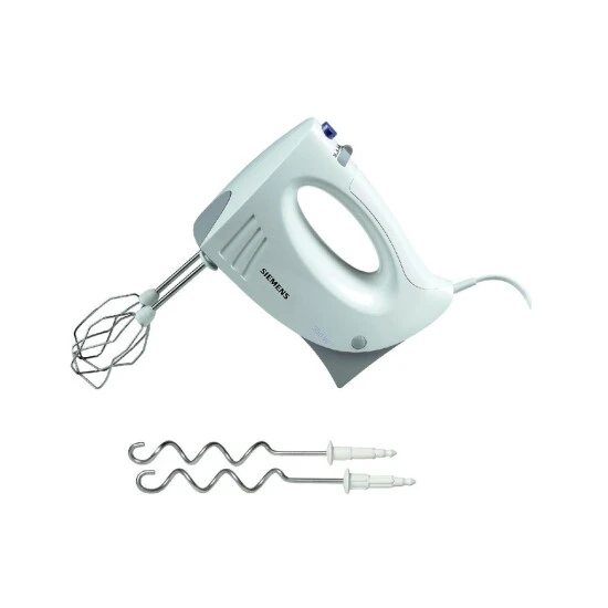 Das Handrührgerät von Siemens arbeitet mit einem 350 Watt starken Motor und ist trotzdem sehr leise. Mit fünf Geschwindigkeitsstufen kann die Drehzahl eingestellt werden. Zusätzlich bietet das Gerät eine Momentstufe. Das Gehäuse ist ergonomisch geformt und ist für Links- sowie Rechtshänder nutzbar. Eine separate Auswurftaste sowie eine Anschlussmöglichkeit für Stabmixer-Zubehör sind vorhanden. Die enthaltenen Turbobesen bieten optimale Schlag- und Rührergebnisse.