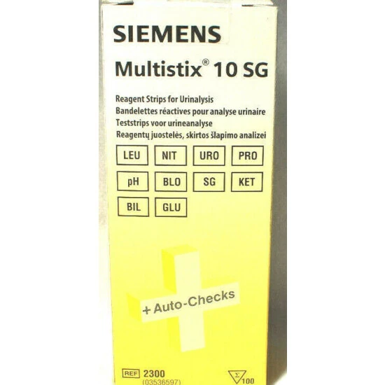 Die Multistix 10 SG Urinteststreifen von SIEMENS dienen der visuellen und instrumentellen Analyse des Urins. Auswertungen können mit Clinitek 50, 500, Clinitek Status und Clinitek Advantus durchgeführt werden. Durch den deutlichen Farbwechsel, der schon bei geringfügigen pathologischen Veränderungen eintritt, sind die Teststreifen sehr genau und leicht abzulesen. Zusätzlich sind die Streifen weitgehende Vitamin C-Resistenz. Folgende Parameter werden bestimmt: – spez. Gewich – ph-Wert – Eiweiß – Glucose – Keton – Leukozyten – Blut – Urobilinogen – Bilirubin – Nitrit