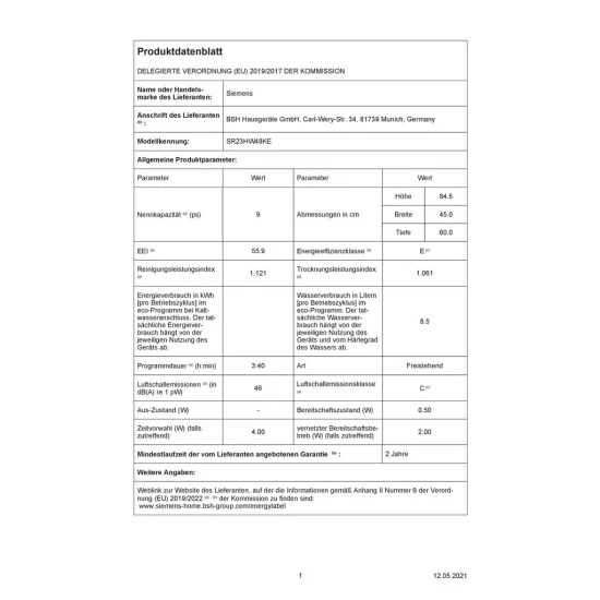 ²Energieverbrauch kWh/100 Betriebszyklen (im Programm Eco 50 °C)