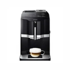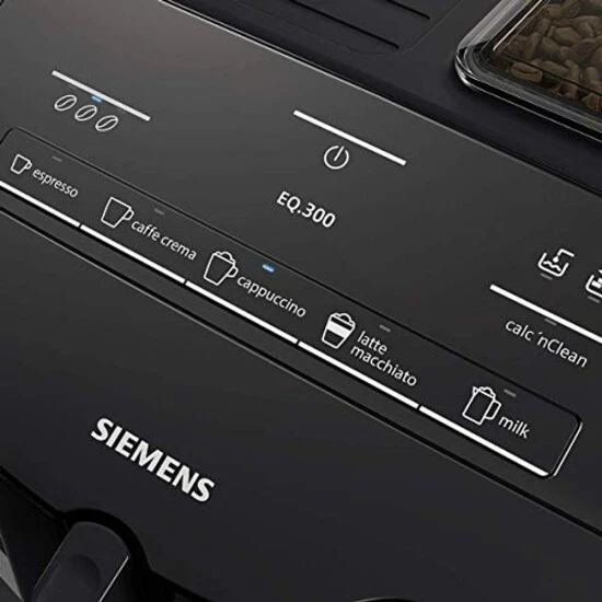 SIEMENS – EQ.300 – 1300 Watt – 15 Riegel – 5 Getränke – 250 g Bohnenbehälter – One-Touch-Funktion – iAroma-Technologie mit Calc’nClean-Wartung – Spülen der automatischen Milchdüse – Keramikmühle – Touchpanel-Piktogramme – Zubehör: Teststreifen x1 – Wassertank: 1,4 l, schwarz – Edelstahlband