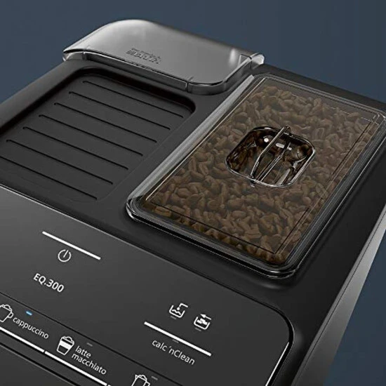 Einzelheiten: Nieuwe EQ.300 superautomatische koffiemachine: Eenvoudige bediening en compact ontwerp Het elegante en compacte ontwerp verbergt veel geheimen, zodat u kunt genieten van een perfect kopje koffie wanneer u maar wilt. De vrijstaande melkcontainer met freshLock behoudt de smaak van de melk door deze te beschermen tegen koelkastgeuren met een intacte kwaliteit. Tot 5 soorten voorgeprogrammeerde dranken, bereid ze met een druk op de knop. Het regelt de hoogte van de koffie-uitloop, zelfs om een late macchiato te bereiden in een glas van 15 cm. Ware perfectie zonder beperkingen.