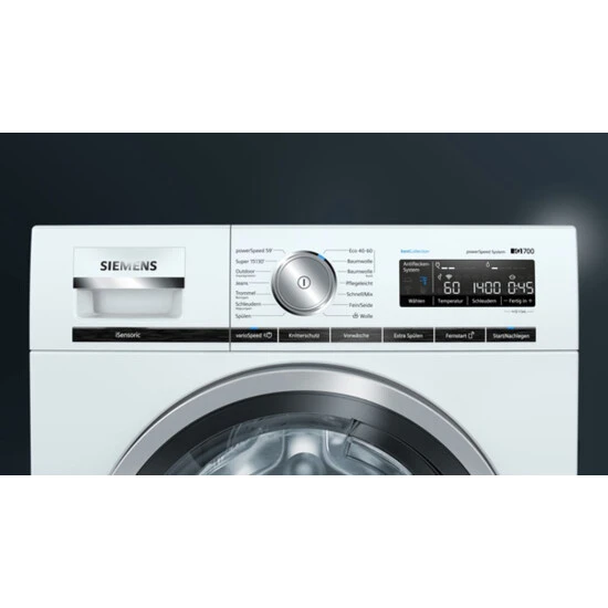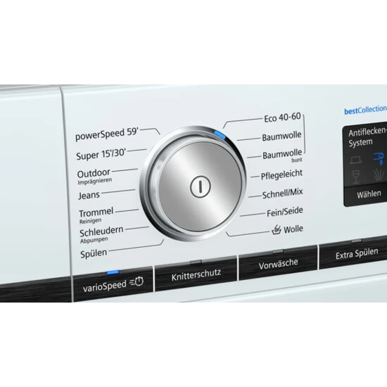 Standardprogramme: Baumwolle, Pflegeleicht, Fein/Seide, Wolle-Handwäsche, Spezialprogramme: Trommel Reinigen (mit Erinnerungsfunktion), Jeans, Outdoor/Imprägnieren, Schleudern / Abpumpen, powerSpeed 59′, Schnell/Mix, Spülen, Super 30’/15′, Home Connect: Fernstart und Fernüberwachung, Energiemanagement, Ferndiagnose, Antiflecken-System mit 4 Flecken – zuschaltbar zu den gängigen Standard-Programmen, touchControl-Tasten: Knitterschutz, Ein/Aus, Fertig in, Fleckenauswahl, Extraspülen, Fernstart, Start / Pause mit Nachlegefunktion, Temperatur, varioSpeed, Vorwäsche, Drehzahlabwahl/ohne Schleudern, LED-Trommelinnenbeleuchtung, iQdrive, anti-vibration Design, waterPerfect Plus:, Schaumerkennung, Unwuchtkontrolle, Kindersicherung, Signal am Programmende, Leichtreinigungsschublade, aquaStop
