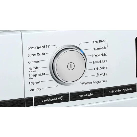 Abpumpen, Automatik, Automatik Sanft, Drehzahlabwahl, Ein/Aus, Fertig, Hemden/Business, Outdoor, Schleudern, Schnell/Mix, Spülen, Start / Pause mit Nachlegefunktion, Steppdecken, Super 30’/15′, Temperatur, varioSpeed, Vorwäsche |